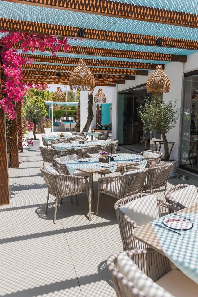 We visited in late September. There’s a welcoming shaded exterior terrace, and spacious interior decorated with the signature aquamarine of the brand, together with faux bougainvillea, evocative of the eastern Mediterranean.