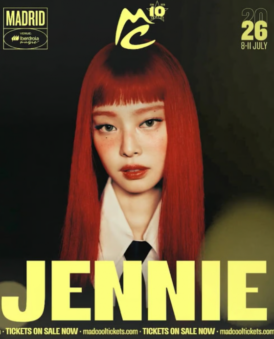 According to the lineup announced on the 10th (local time), Jennie will headline the July 9 show at the 2026 Mad Cool Festival, which will be held from July 8–11, 2026, in Madrid, Spain. Notably, Jennie joins world-renowned acts such as Foo Fighters, Florence + the Machine, Twenty One Pilots, and Nick Cave & The Bad Seeds as one of the headliners—standing out as the only K-pop artist included in the lineup.