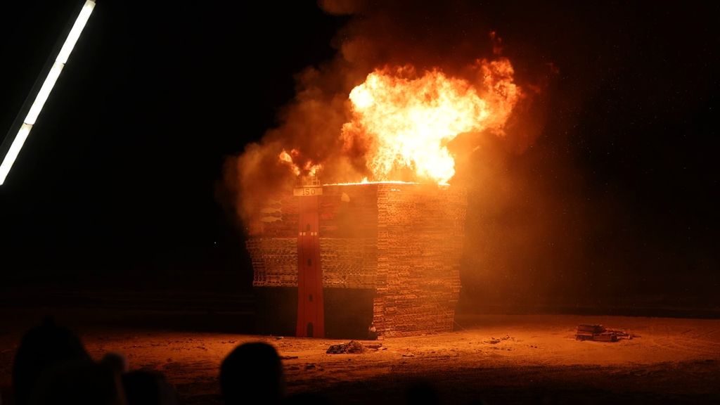 Vreugdevuur Scheveningen vanwege stevige wind eerder dan normaal aangestoken