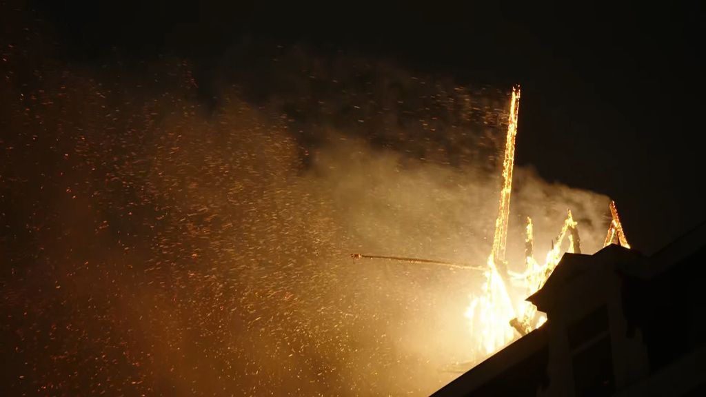 “De vlammen slaan uit het dak van de toren. Maar het grootste probleem is de enorme vonkenregen die in een groot gebied neerslaat. Er vallen ook stukken hout naar beneden, dus het is gevaarlijk.”