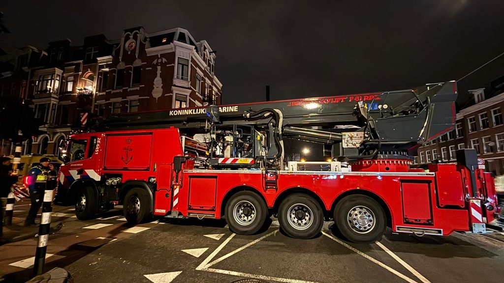 Bij het blussen krijgt de Amsterdamse brandweer hulp van een blusvoertuig van de marine.