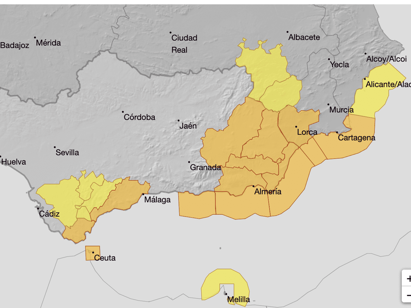 The areas on orange alert today include the Costa del Sol, Campo de Gibraltar, the coast of Almeria and large parts of Granada.
