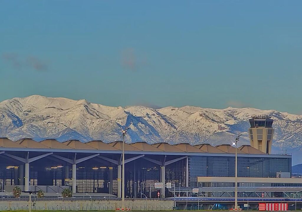 • Snow covers mountains behind Malaga’s Costa del Sol